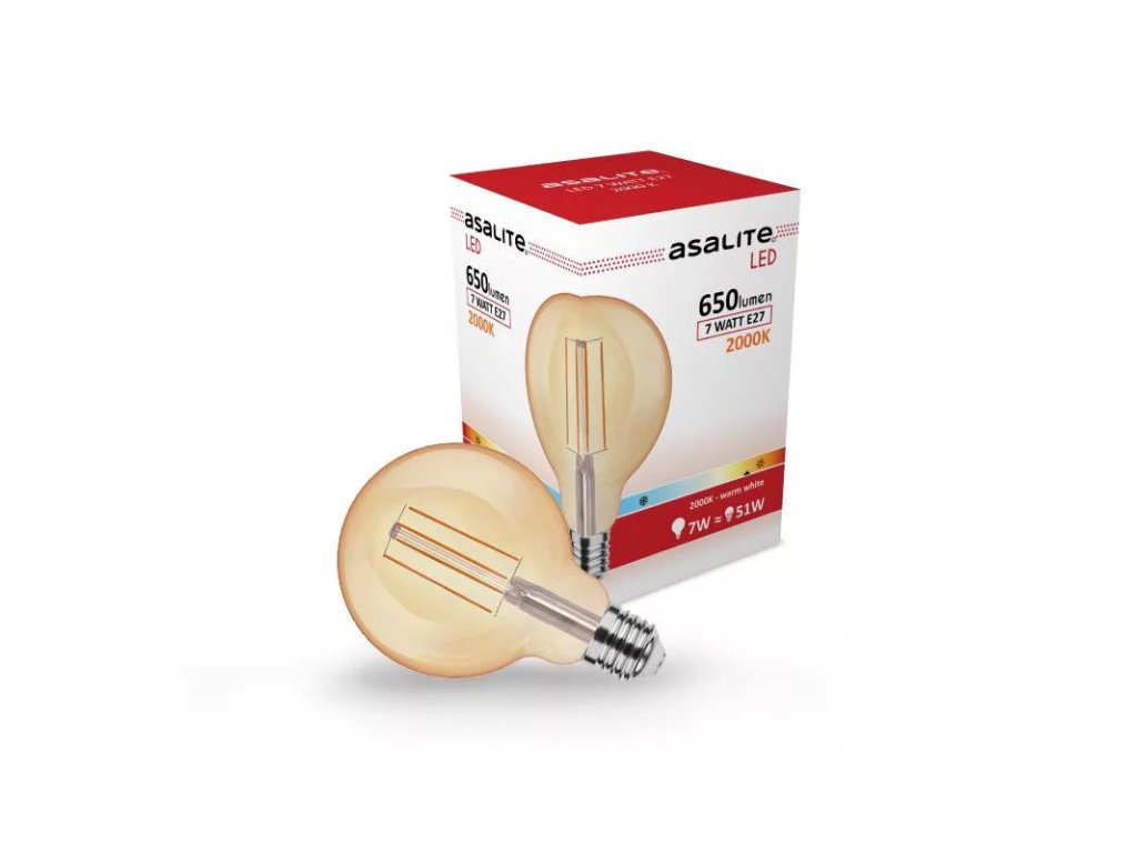 LED filament žiarovka so závitom E27, výkon 7 W, náhrada za približne 50 W klasickú žiarovku, svietivosť 650 lm, oranžové sklenené (amber) telo pre farbu svetla 2000K, krytie žiarovky IP20, životnosť 25 000 hodín a 12 500 zapínacích cyklov, energetická trieda G, záruka 24 mesiacov.