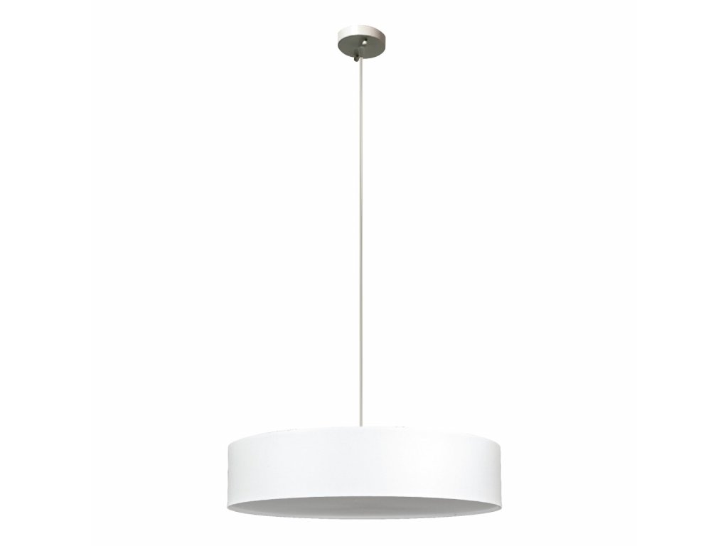 Biely luster na 3 x E27 (max. 3 x 42 W) žiarovku v kombinácii plast+kov+ plátno, priemer tienidla 50 cm x výška 11 cm, maximálna dĺžka lustra 113 cm, stupeň krytia IP20.