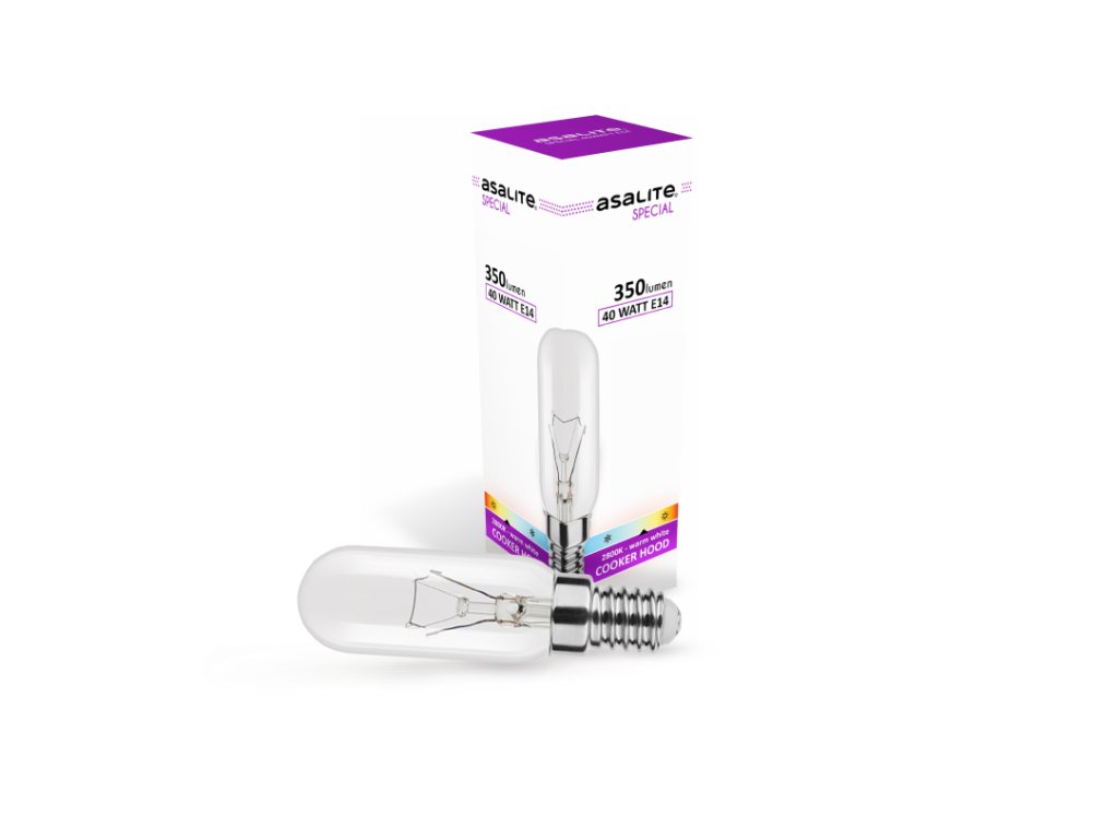 Kompaktná žiarovka s E14 závitom určená do digestorov s výkonom 40 W, svietivosť 350 lm, farba svetla teplá biela (2800K), uhol svietenia 180°, životnosť cca 1000 h a 4000 zapínacích cyklov, energetická trieda G, rozmer 25 x 82 mm